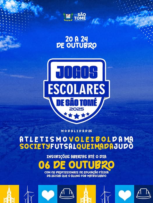 A Prefeitura Municipal de São Tomé tem a satisfação de anunciar a realização dos Jogos Escolares, que ocorrerão de 20 a 24 de outubro.📌 Modalidades:Atletismo, Voleibol, Dama, Society, Judô, Futsal e Queimada.📝 Inscrições abertas até o dia 06 de outubro➡️ Devem ser feitas com os profissionais de Educação Física da escola onde o(a) aluno(a) está …