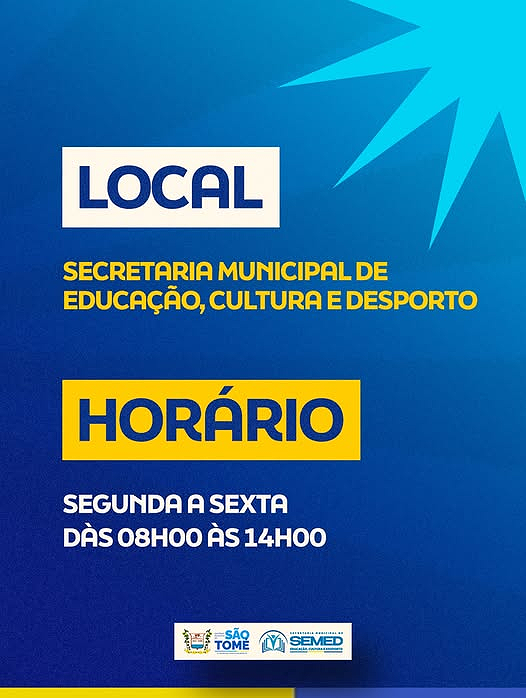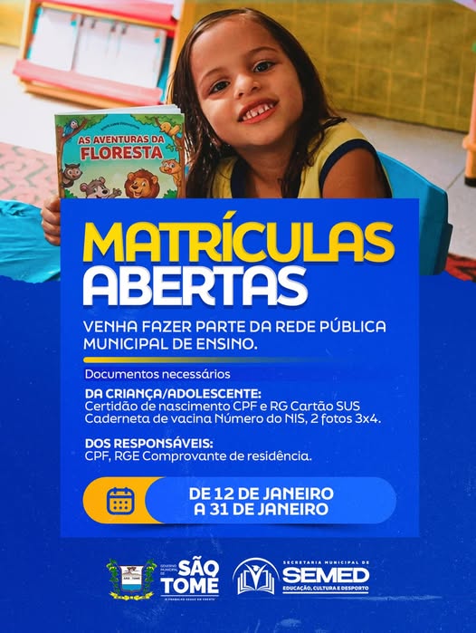 Chegou a hora de garantir o futuro das nossas crianças e adolescentes. As matrículas da rede pública municipal de São Tomé já estão abertas! 💙🗓 Período: de 12 a 31 de janeiro📍 Escolas MunicipaisEducação de qualidade, acolhimento, cuidado e compromisso com o desenvolvimento dos nossos alunos. Aqui tem tudo o que seu filho precisa para …