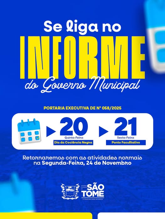 Nesta quinta-feira (20), em razão do Dia da Consciência Negra, e na sexta-feira (21), por ponto facultativo, não haverá expediente nas repartições públicas municipais.Retornaremos com nossas atividades normais na segunda-feira, 24 de novembro.Contamos com a compreensão de todos!Governo Municipal de São Tomé — O trabalho segue em frente