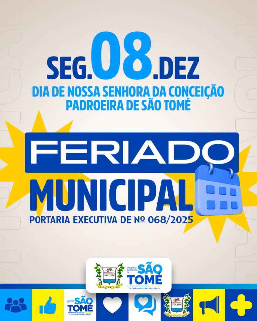 📅 Nesta segunda, 08 de dezembro, São Tomé celebra o Dia de Nossa Senhora da Conceição, nossa padroeira.Por determinação da Portaria Executiva nº 068/2025, a data será feriado municipal.Que seja um dia de fé, tradição e união para todas as famílias tomenses. ✨💙Governo Municipal de São Tomé – O trabalho segue em frente.