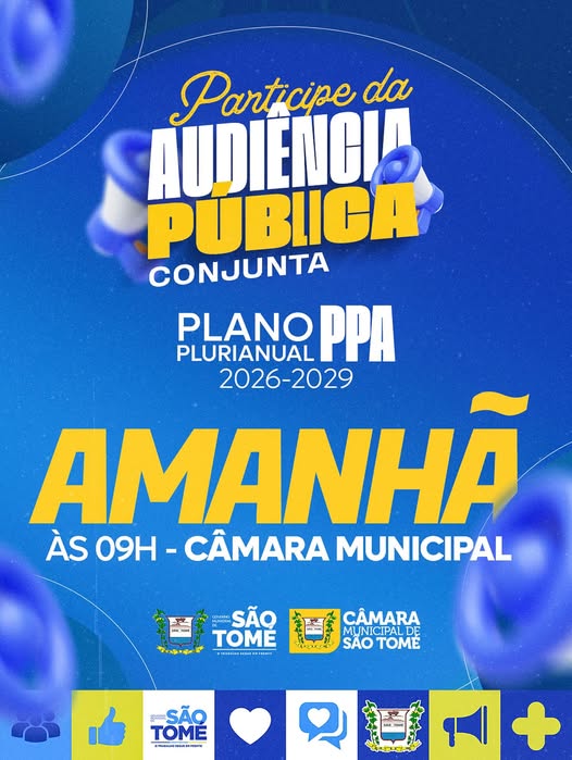 Convidamos toda a população de São Tomé a participar desse momento importante de diálogo e construção coletiva. 🏛️⠀🗓 Data: 03/09⏰ Hora: 9h📍 Local: Câmara Municipal de São Tomé⠀Sua participação é fundamental para ajudarmos a planejar o futuro da nossa cidade