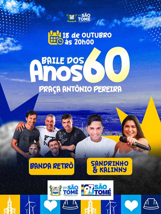 No dia 18 de outubro, às 20h, a Praça Antônio Pereira será palco do inesquecível Baile dos Anos 60! 🎶Com shows da Banda Retrô e Sandrinho & Kalinny, a noite promete muita nostalgia, alegria e diversão! 🌟Venha viver essa viagem no tempo e celebrar os 97 anos de emancipação política de São Tomé com muito …